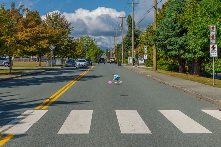 “Pavement Patty” is a 3D illusion of a girl chasing a ball into the street, intended to remind drivers to slow down because unexpected incidents can and do happen. She’s installed in the school zone of Brentwood Park Elementary School in Burnaby as an unmissable visual cue to remind parents to take extra care, adhere to the speed limit, and reduce distractions.
